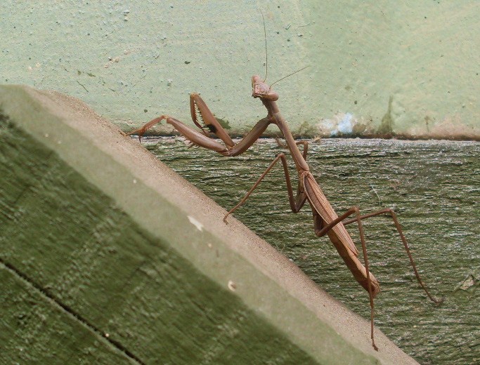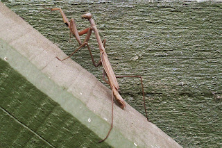 I wondered whether my sweeping had disturbed this praying mantis as he was near the stairs at the back of the house, and not safely in a bush. He was still camoflagued well. Usually the praying mantises in our garden are green so I took some time to take in his brown colour and noticed the subleties in tone and patterns. The feeling of busyness from the morning of washing clothes, sweeping and clearing cobwebs was gone. I felt mesmerised. As often happens when witnessing something special I wished my daughter was home to see this friend, and as she was at school the camera came out.